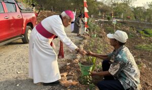 Mgr. Fransiskus Kopong Kung Menanam Pohon di Bukit Doa Watomiten