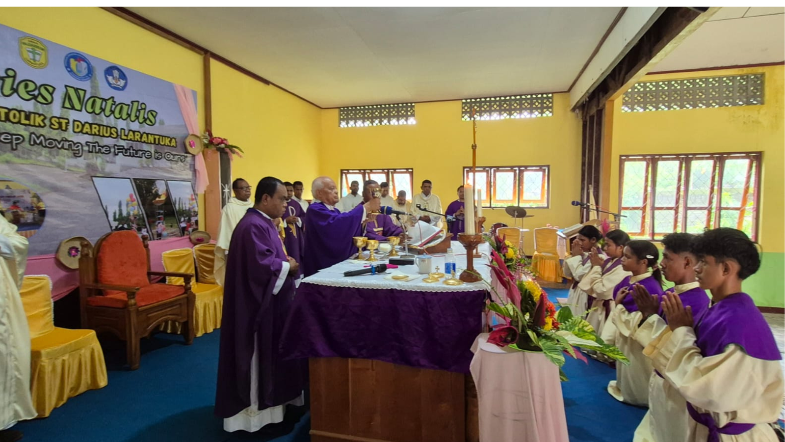 Perayaan Ekaristi dipimpin langsung oleh Uskup Emeritus Keuskupan Larantuka, Mgr. Fransiskus Kopong Kung. Beliau didampingi oleh sejumlah imam konselebran, di antaranya Ketua Yayasan Persekolahan Umat Katolik Flores Timur (Yapersuktim), RD. Thomas Labina, dan Kepala Sekolah SMA St. Darius, RD. Antonius Sina Aran. Kehadiran para imam, guru, pegawai, serta seluruh siswa-siswi menciptakan suasana liturgi yang khidmat sekaligus akrab.