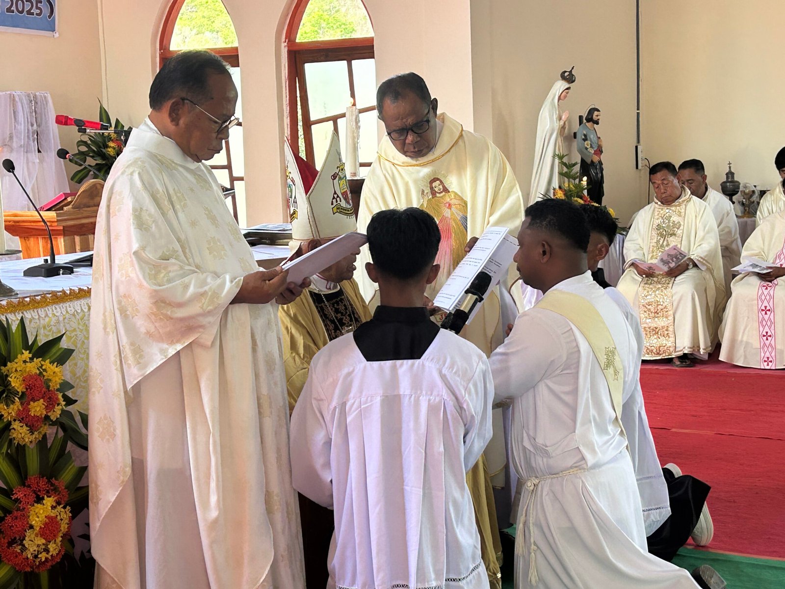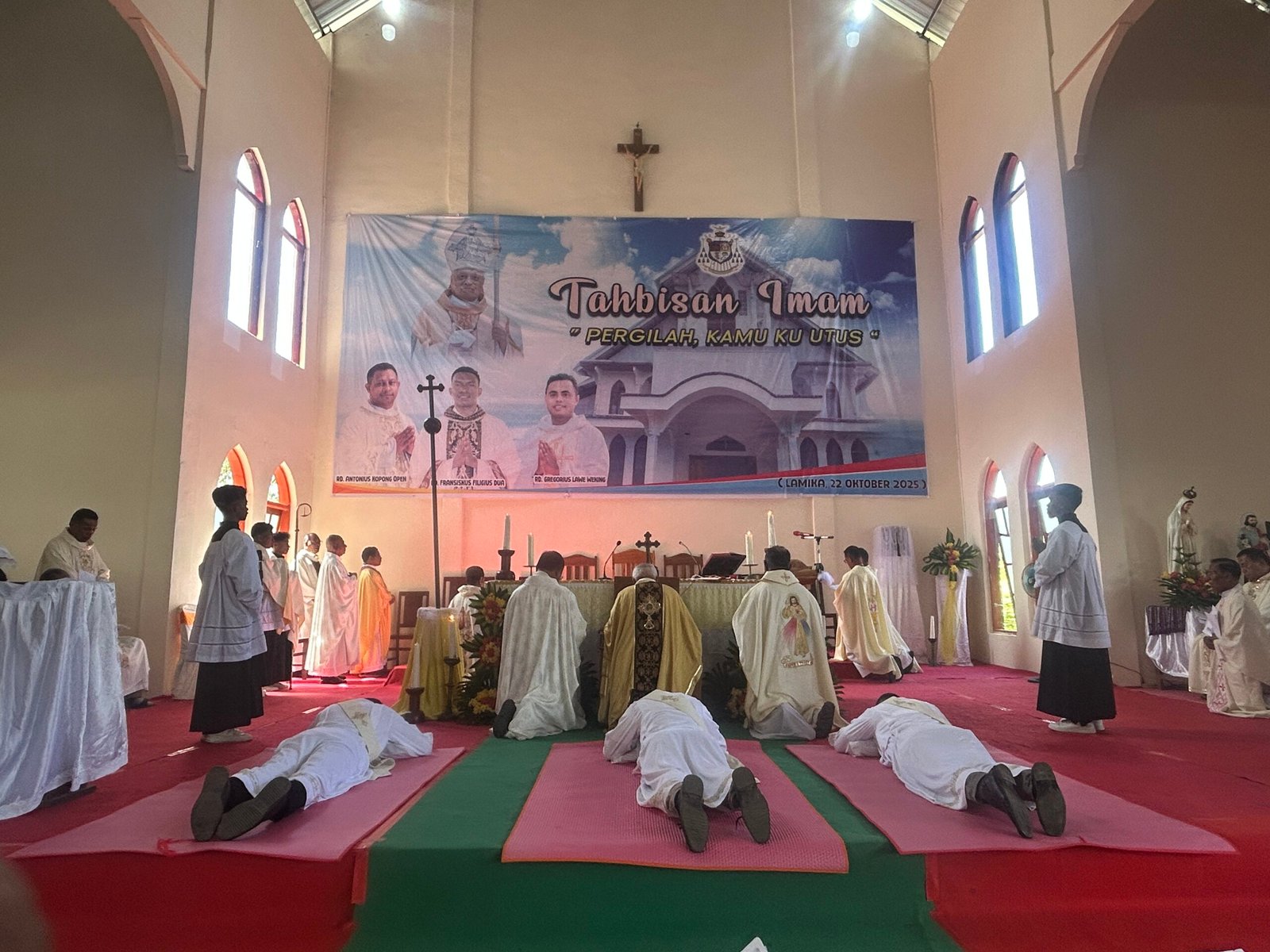Ketiga imam baru itu adalah RD. Antonius Kopong Open, putra asli Paroki Lewokluok–Bama, dengan moto tahbisan “Ikutlah Aku” (Luk 5:27); RD. Gergorius Lawe Weking, dari Paroki Sta. Maria Imakulata Lewolaga, dengan moto tahbisan “Aku telah mengenal engkau” (Yer 1:5); dan RD. Fransiskus Viligius Du’a, dari Paroki San Juan Lebao Tengah, dengan moto tahbisan “Menurut Perkataan-Mu” (Luk 1:38). Perayaan Ekaristi tahbisan berlangsung penuh khidmat dan haru. Sejak awal misa, umat memadati ruangan dan halaman gereja Stasi Lamika, menyatu dalam doa dan kidung pujian.