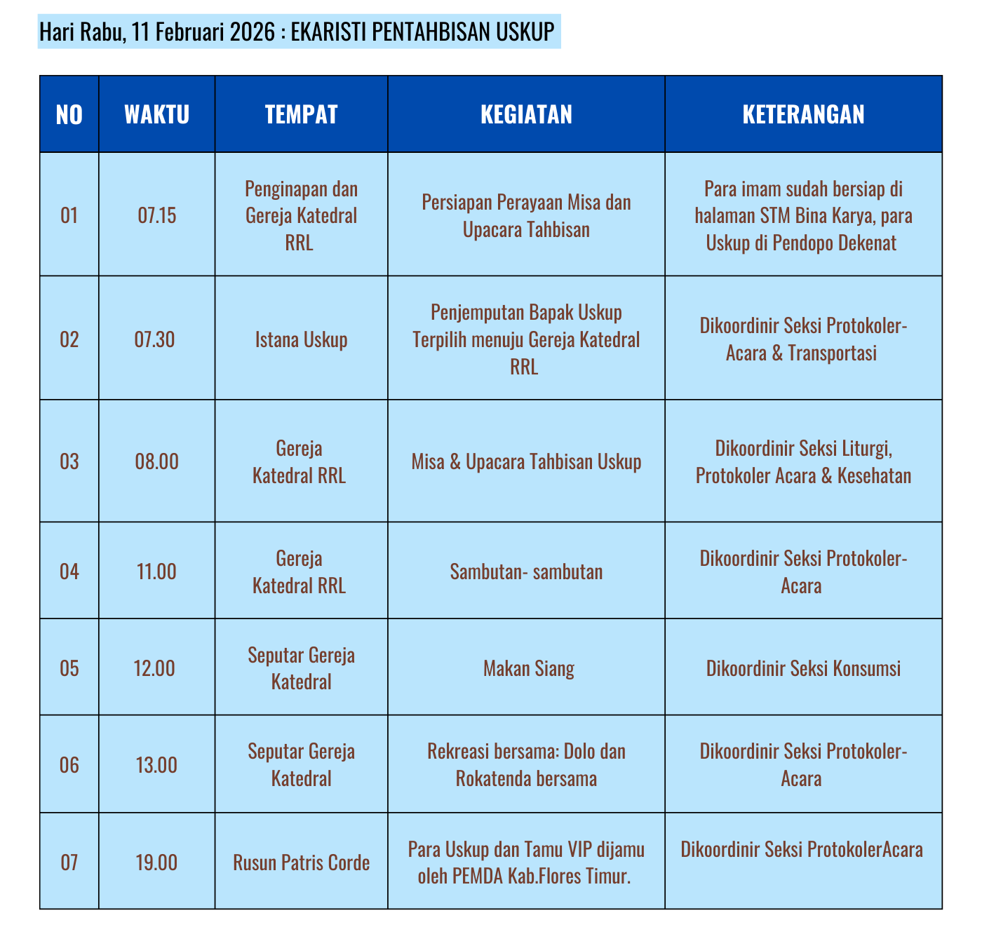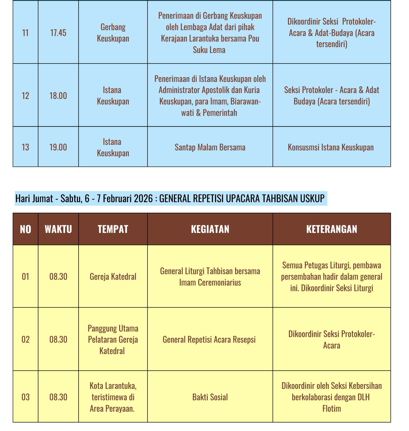 Perayaan Tahbisan Uskup Larantuka akan dilaksanakan pada hari Rabu, 11 Februari 2026, di Gereja Katedral Reinha Rosari Larantuka pada pkl. 08.00 Wita. Perayaan tahbisan ini akan dipimpin oleh Mgr. Fransiskus Kopong Kung, yang didampingi oleh Mgr. Paulus Budi Kleden, Uskup Agung Ende dan Mgr. Ewaldus Martinus Sedu, Uskup Maumere. Setelah ekaristi tahbisan, para Uskup akan mengahadiri acara makan siang bersama para Imam, Biarawan/i, Undangan dan Umat di pelataran Gereja Katedral Reinha Rosari Larantuka.