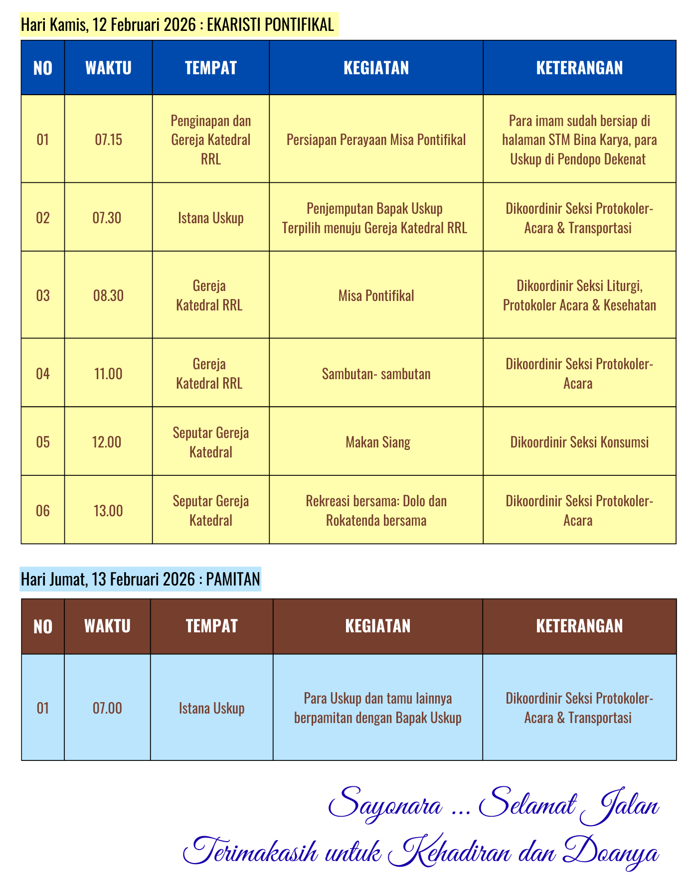 Peristiwa penahbisan Uskup merupakan momen iman yang sangat bermakna bagi Gereja, khususnya bagi Gereja Lokal Keuskupan Larantuka. Kehadiran seorang gembala baru adalah anugerah Tuhan bagi umat-Nya. Oleh karena itu, seluruh rangkaian acara, mulai dari penjemputan, perayaan Vesper Agung, Upacara Tahbisan, hingga Misa Pontifikal, dirancang dan dilaksanakan dengan penuh kekhidmatan, tanggung jawab, serta semangat kebersamaan. Akan halnya ini, panitia mengemas seluruh rangkaian acara dalam panduan sederhana. Panduan ini disusun sebagai pedoman bagi seluruh panitia, petugas liturgi, para Bapak Uskup, para imam, tamu undangan, dan umat, agar setiap tahapan acara dapat berjalan secara tertib, terkoordinasi, dan sesuai dengan tata perayaan Gereja Katolik. Panduan ini berisi seluruh rangkai acara, mulai dari penjemputan hingga misa pontifikal. Semoga panduan ini dapat membantu menciptakan keselarasan gerak dan pemahaman bersama demi kelancaran seluruh rangkaian acara Penjemputan, Vesper Agung, Tahbisan dan Misa Pontifikal Uskup Larantuka.