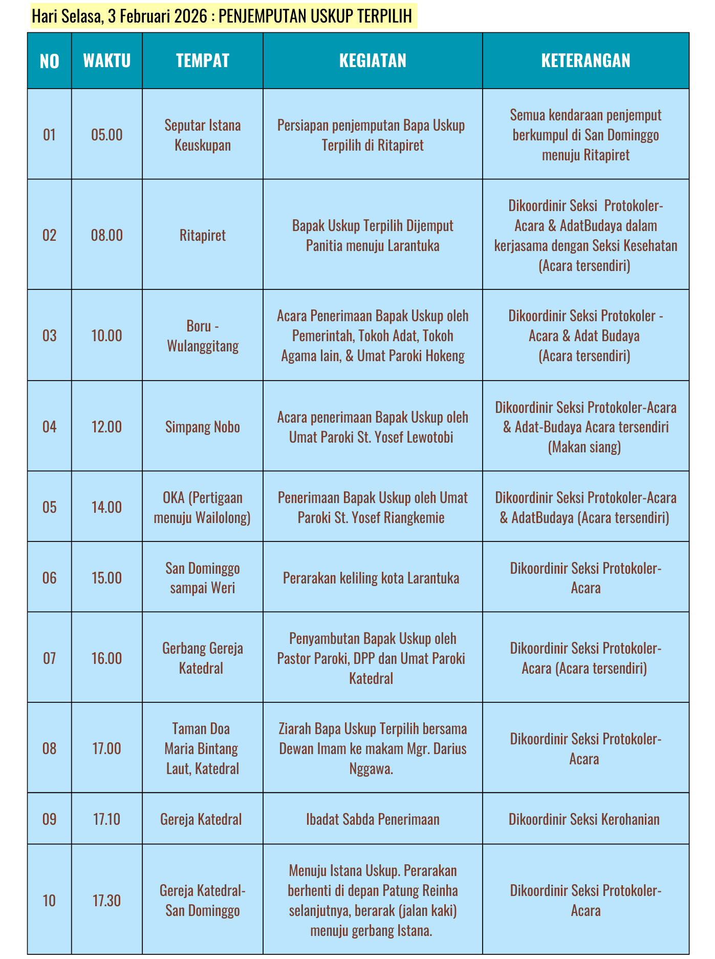 Bapak Uskup akan dijemput di Seminari Tinggi Interdiosesan St. Petrus Ritapiret oleh: (1) Ketua Umum Panitia: RD. Adeodatus Hendrikus Leni, (2) Perwakilan para Imam: RD. Leo Lewokrore dan RD. Antonius Londa Diazyanto, (3) Perwakilan DPP: Ketua DPP St. Ignatius Waibalun (4) Perwakilan Pemerintah: Sekda Flores Timur, (5) Perwakilan Tokoh Agama: Protestan, Islam, Hindu, (6) Tokoh Masyarakat/Umat: Ibu Rosalia Noi, (7) Tokoh Adat: Bapak Frans Nara Maran.
