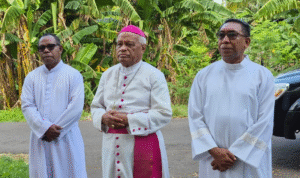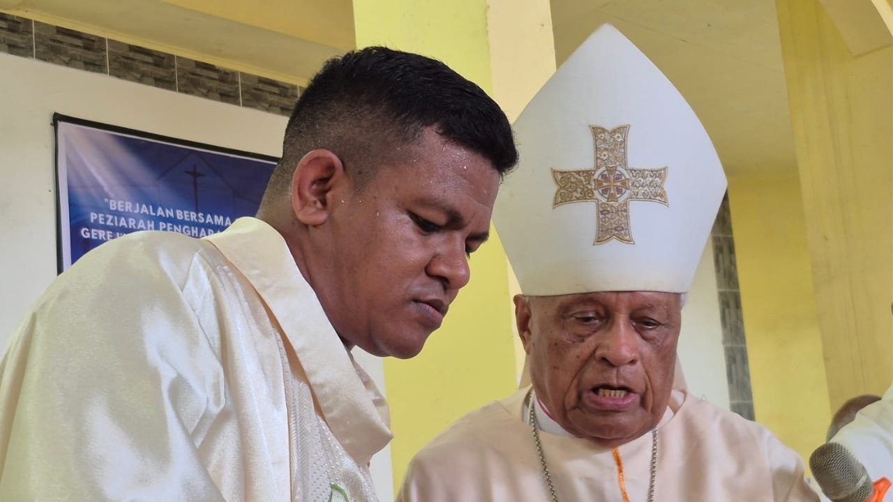 Administrator Apostolik Keuskupan Larantuka, Mgr. Fransiskus Kopong Kung dan RD. Hendrikus Haju Liwun, Pastor Paroki Pertama St. Antonius Waibreno.