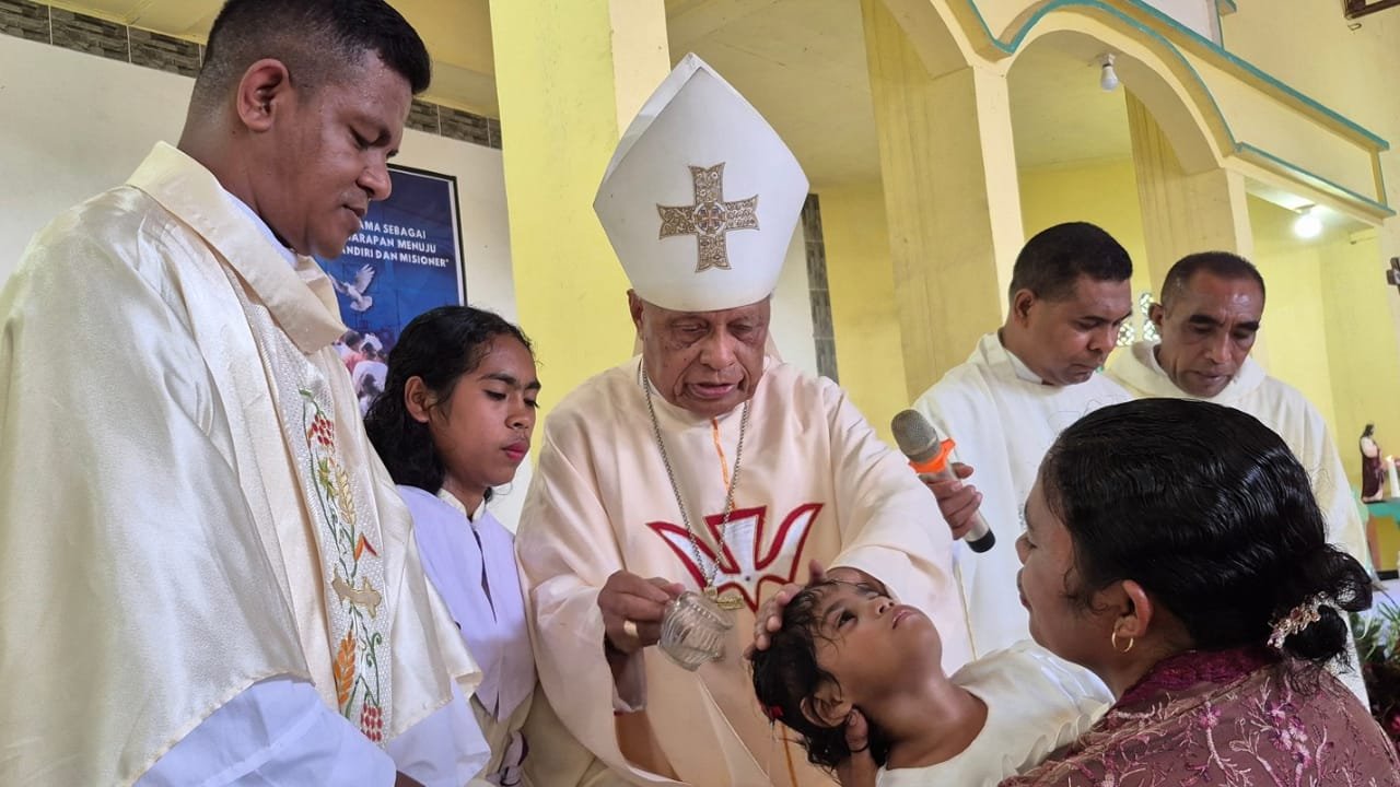 Administrator Apostolik Keuskupan Larantuka, Mgr. Fransiskus Kopong Kung Membaptis Anak di Paroki Baru Waibreno.